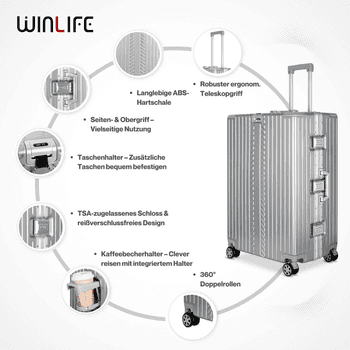 Die 4x 360°-Doppelrollen garantieren eine reibungslose und leise Bewegung in jede Richtung, während das höhenverstellbare Teleskopgestänge für eine komfortable Handhabung sorgt. Für zusätzliche Sicherheit ist der Koffer mit einem TSA-Zahlenschloss ausgestattet, das Ihre Wertsachen schützt und die Sicherheitskontrollen bei internationalen Reisen erleichtert.
